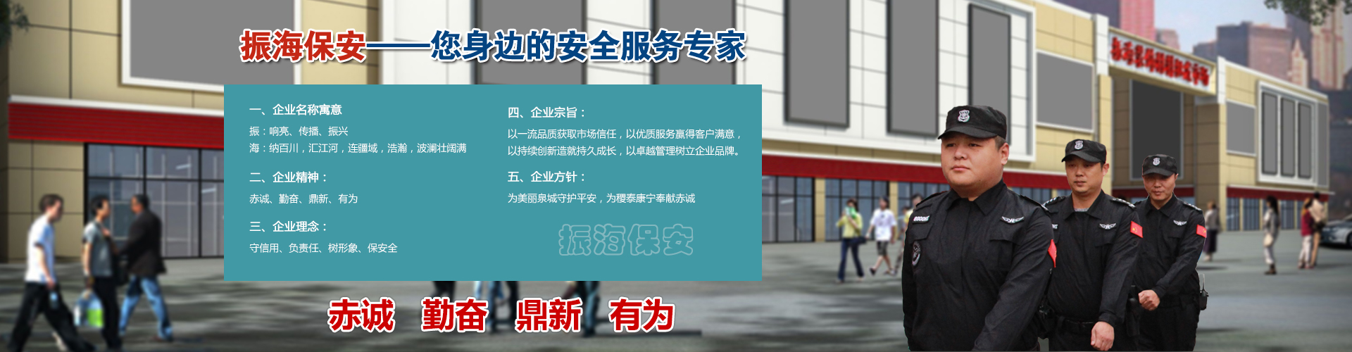 山東振海保安服務有限公司是一家知名山東保安公司,濟南保安公司,軍事化管理,專業化安保隊伍,始終堅持保安服務正確方向,把社會效益放到首位